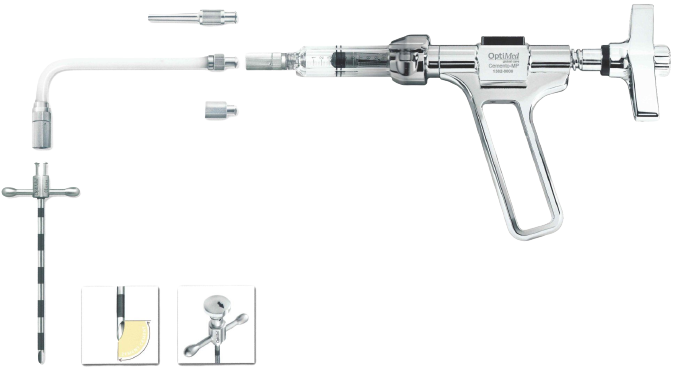 Die großdimensionierte Flügelschraube lässt sich mit geringstem Kraftaufwand bedienen und ermöglicht neben der gewohnt feinen Dosierung einen sehr hohen Druckaufbau. Die zugehörigen Spritzenzylinder sind mit speziellen Wandverstärkungen ausgestattet. Der hohe Arbeitsdruck bei der Zementapplikation ermöglicht eine sichere Injektion und sorgt insbesondere bei inhomogenen Kavitäten und stark porösen Wirbelkörpern für einen sehr hohen Befüllungsgrad.