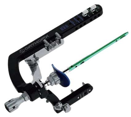 Das Sprunggelenk-Arthrodesen-Nagelsystem beinhaltet eine zweiteilige Zielführungsvorrichtung. Der proximale Zielführungsarm ist fest und der distale Zielführungsarm rastet in 90 Grad-Stufen ein, so dass sich eine stabile Plattform für den gesamten Vorgang bilden lässt. Die anatomisch geformte Fersenkappe sorgt während der externen Kompression für stabilen, gleichmäßigen Druck auf die Ferse. Die einfache Handhabung der Zielführungsvorrichtung reduziert die Verfahrensdauer. Dies wird unterstützt durch die intuitiven farblichen Markierungen. Die Flexibilität der Vorrichtung bietet außerdem die Möglichkeit der Zielführung für Calcaneus-, Talus- und Tibiaschrauben in der gewünschten Ebene. |