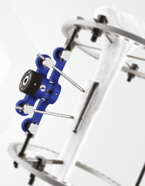 Der Fixateur wird vormontiert geliefert, was eine schnelle Fixierung des Geräts mit den Knochenschrauben ermöglicht. Das Design wurde so gestaltet, dass der Fixateur montiert werden kann, selbst wenn sich die Fixateurschrauben in verschiedenen Ebenen befinden. Alle Komponenten werden steril bereitgestellt, wodurch der Anwender Zeit und Geld spart.